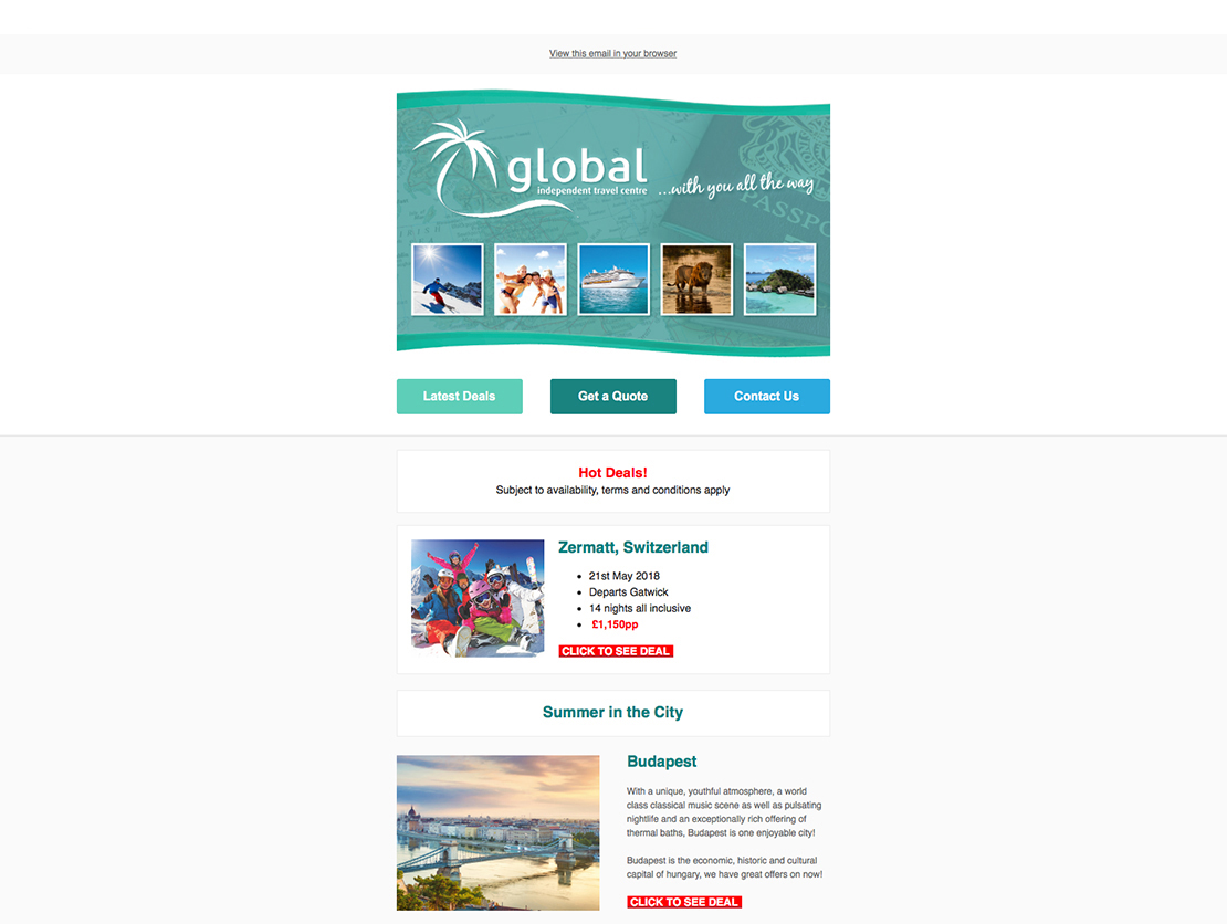 I set up a selection of email marketing templates for Global Independent Travel using the 'Mailchimp' platform; that they use to send out regular emails detailing the latest deals, special offers and news of upcoming events to their client database.